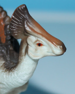 What immediately catches the eye is certainly the triangular skull surmounted by the characteristic crest; its shape is correct: starting from the muzzle it projects backward and then expands into a wide fan. For the coloring, CollectA has opted for a not aggressive choice: in fact, it is colored in light and dark brown. The eyes are a bit too large and placed slightly lower than where they are usually reconstructed. Behind the eyes, there is a strange bump, which probably matches the skull shape. However, it gives an effect similar to that of mammalian ears.